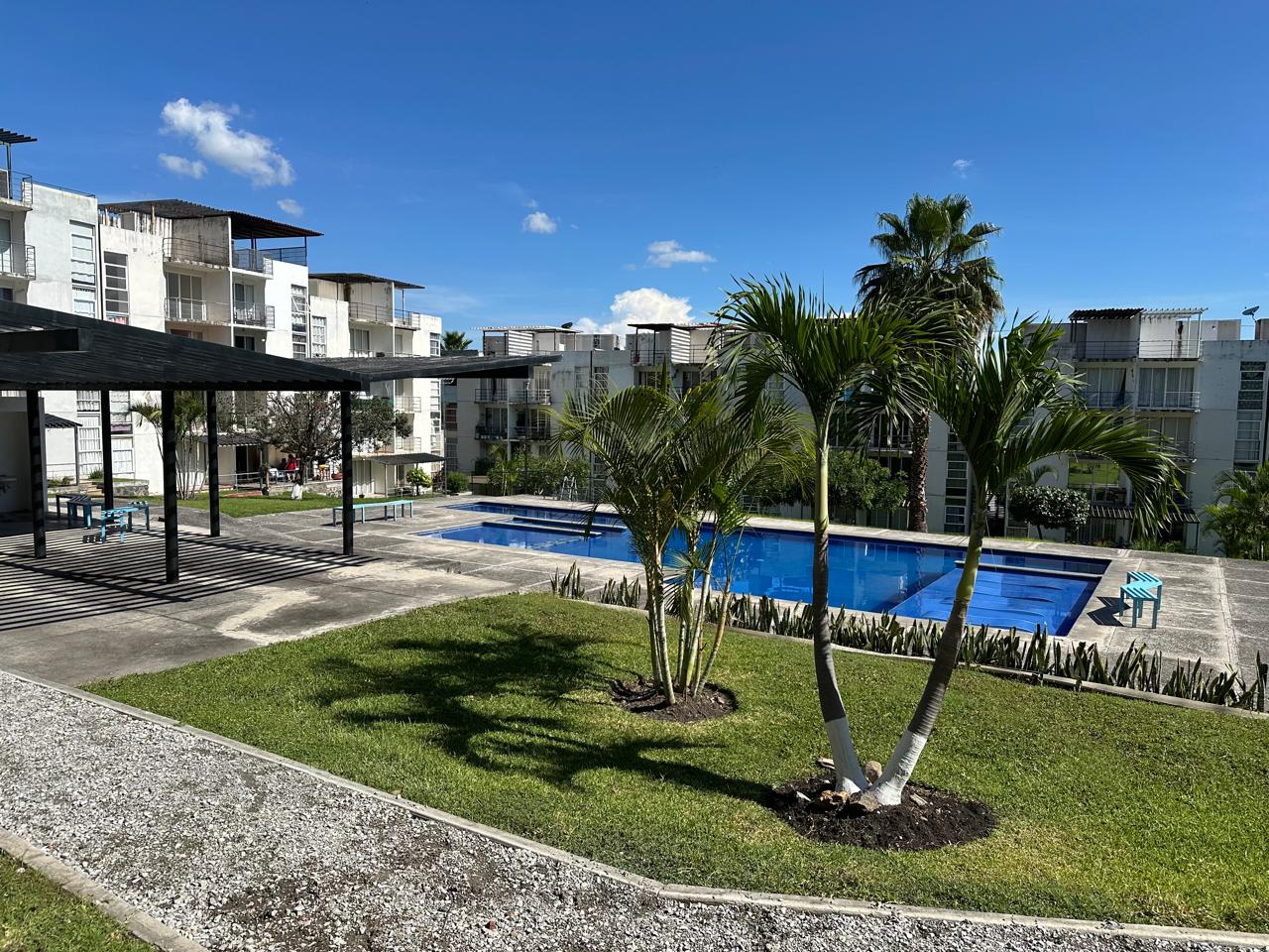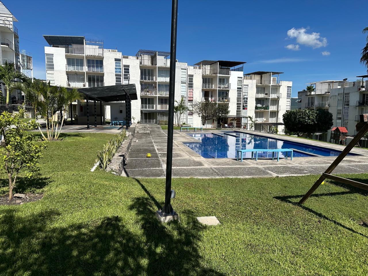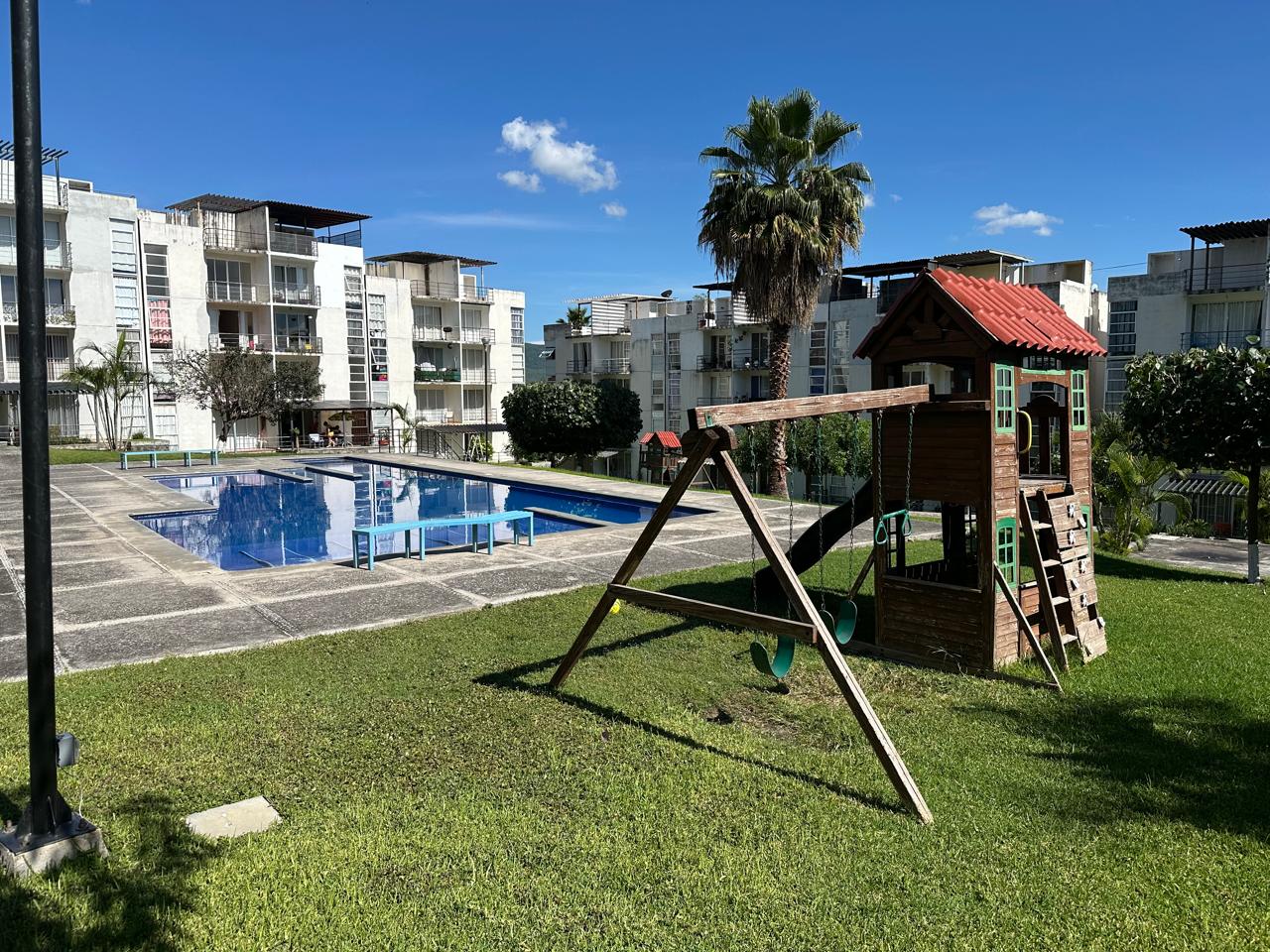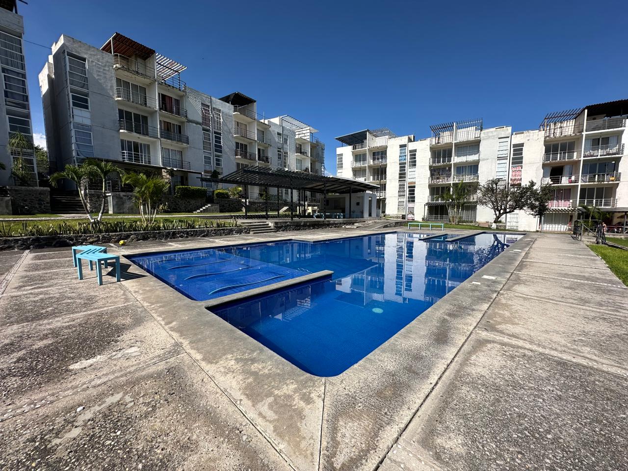 60m2C, 71m2 T, en col. Emiliano Zapata cerca de la UTEZ, en 1er. piso, con loseta, cocina integral tinaco, compresor en patio de servicio, 2 Habitaciones con medios closets, Sala, Comedor y Balcón, 1 cajón de estacionamiento, Seguridad 24Hrs, Jardín y Alberca y palapa con baños para disfrutar.